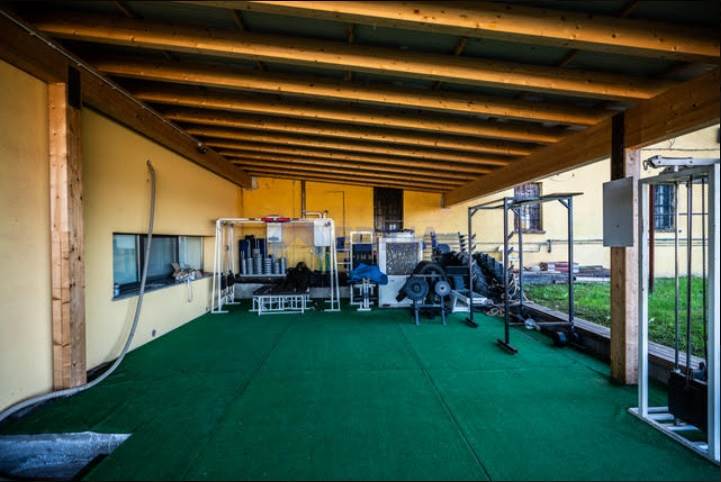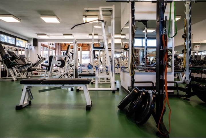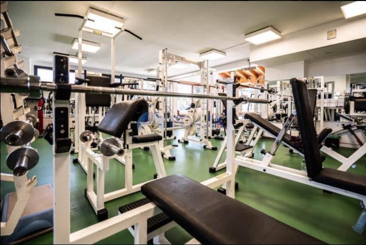 Zona coperta: tappeto verde sintetico a copertura del fondo. Attrezzi isotonici: croci, leg extension, pressa ad aria, abductor, abductor in piedi, panca piana, poliercoline, lat machine, gabbia per squat, panche, manubri, bilancieri, dischi, tappetini.